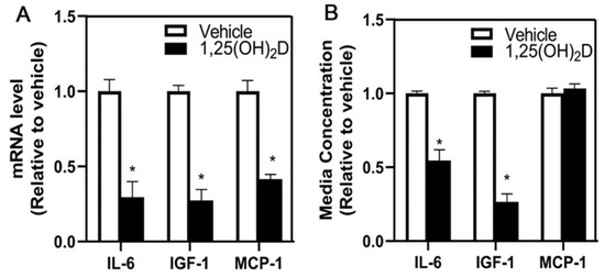 mRNA levels and release of adipokines, IL-6, IGF-1, and MCP-1 following vehicle or 1,25(OH)2D treatment of mature 3T3-L1 adipocytes. (A) IL-6, IGF-1, and MCP-1 mRNA levels were measured following vehicle or 1,25(OH)2D treatment in adipocytes by reverse-transcription PCR and normalized to 18S. (B) The concentration of IL-6, IGF-1, and MCP-1 in conditioned media from 3T3-L1 with treatment of vehicle or 1,25(OH)2D was measured. The values are expressed per vehicle and as mean ± SEM. An asterisk indicates a significant difference relative to the vehicle (p < 0.05).