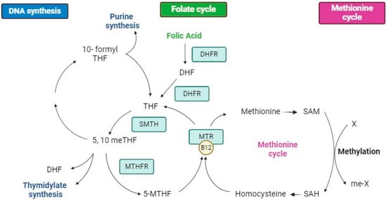 Folate is a general term used to describe natural and synthetic forms of vitamin B9. It is a generic term for a family of compounds known as vitamers which consist of a common biochemical structure but differ in the number of glutamic acids, oxidation state, and the presence of one-carbon groups (e.g., folic acid (FA), 5-methyltetrahydrofolate (5-MTHF), tetrahydrofolate (THF), or dihydrofolate (DHF)) []. Folates are essential nutrients that cannot be synthesised and, therefore, must be provided through diet and/or dietary supplements []. Specifically, FA, whose chemical form is pteroylglutamic acid, is a synthetic compound (as is any form used for exogenous folate supplementation) with a similar folate structure but with much higher bioavailability. It is the only folate form authorised in fortified foods and, particularly, in drugs. FA must first be reduced by the dihydrofolate reductase (DHFR) enzyme in the liver to DHF, then to THF, and then to be further converted to 5,10-methylene-THF and 5-MTHF, all metabolites of the folate cycle (Figure 1). It should be noted that these metabolites are continuously interconverted to each other, given the cyclic nature of folate metabolism.