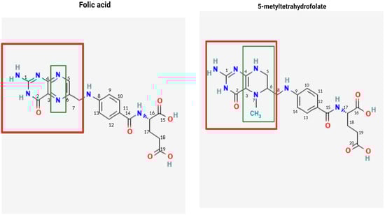 - Scaglione, F.; Panzavolta, G. Folate, folic acid and 5-methyltetrahydrofolate are not the same thing. Xenobiotica 2014, 44, 480–488. [Google Scholar] [CrossRef]