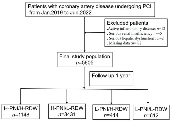 A retrospective cohort study was conducted. A total of 5605 patients with CAD who underwent percutaneous coronary intervention (PCI) admitted to the Second Hospital of Tianjin Medical University from 1 January 2019 to 30 June 2022 were selected.