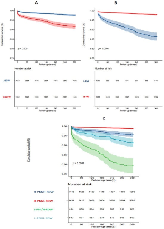 Kaplan–Meier analysis for all-cause mortality. The survival curves are stratified by the RDW level (A), PNI level (B), and both (C).