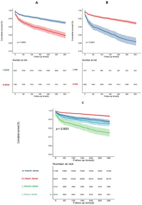 Kaplan–Meier analysis for 1-year MACCEs. The survival curves are stratified by the RDW level (A), PNI level (B), and both (C).