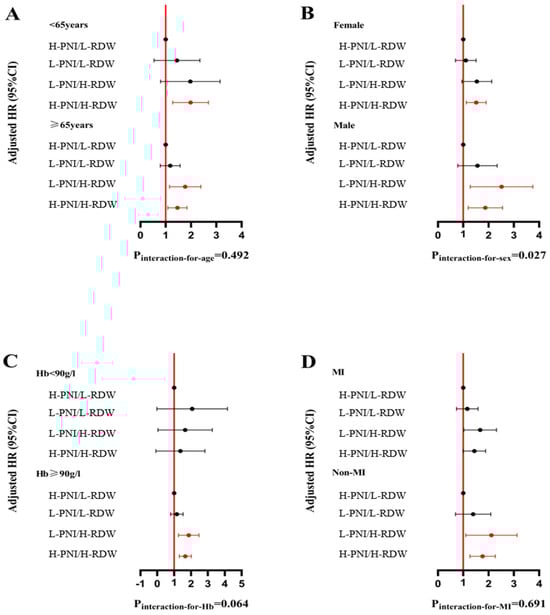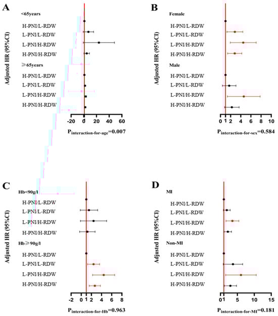 The association of the RDW and PNI level with 1-year MACCEs. In the Forrest plots for subgroups, red indicates statistical significance, while black indicates statistical non-significance. Subgroups were defined by age (A), sex (B), Hb category (C), and admission presentation (D).