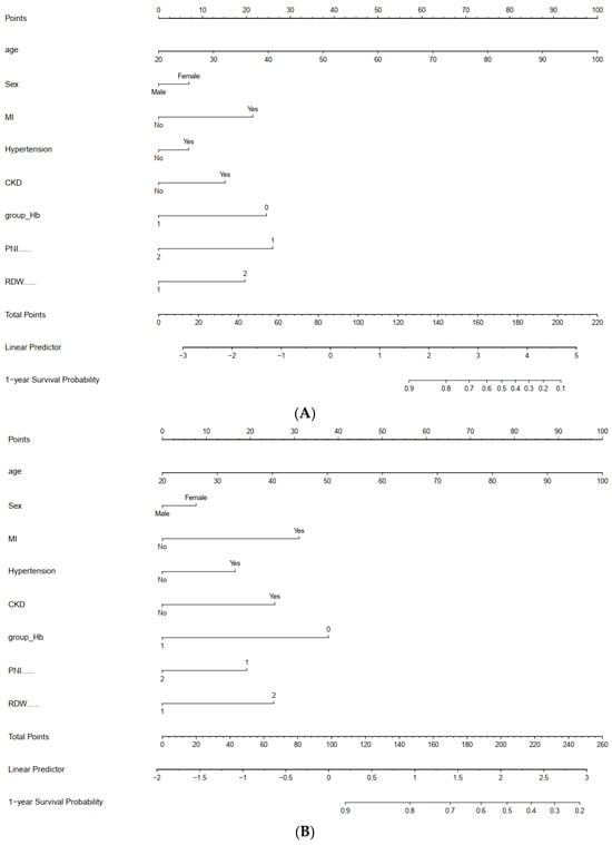 Nomograms for 1-year ACM (A) and MACCEs (B) undergoing PCI.