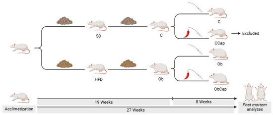 Schematic representation of experimental protocol (27 weeks). SD: standard diet (n = 17); HFD: high-fat diet (n = 27); C: control (n = 11); CCap: standard diet with capsinoids (n = 6); Ob: obese (n = 13); ObCap: obese with capsinoids (n = 14).