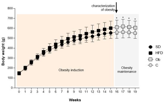 Evolution of body mass during the period of exposure to experimental diets. Groups SD: standard diet (n = 17); HFD: high-fat diet (n = 27). After the onset and characterization of obesity, the groups were renamed: Groups C: control (n = 17), Ob: obese (n = 27). Values are expressed as mean ± standard deviation. Two-way ANOVA for independent samples complemented with Bonferroni post hoc test—* p < 0.05 Ob vs. C.
