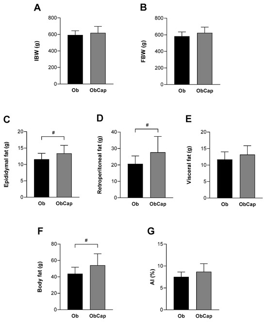 Body weight and adiposity profile after treatment with capsinoids. (A) IBW: initial body weight. (B) FBW: final body weight. (C–E): fat pads. (F): body fat. (G): AI: adiposity index. Groups Ob: obese (n = 13); ObCap: obese treated with capsinoids (n = 14). Values are expressed as mean ± standard deviation. Student t-test for independent samples—# p < 0.05—ObCap vs. Ob.