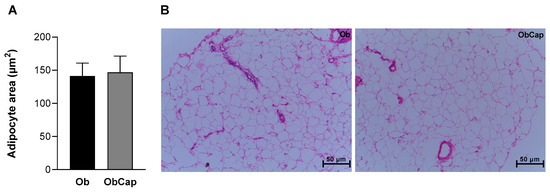 Furthermore, in relation to visceral adipose tissue, no difference was observed in adiposity area among groups, revealing the existence of heterogeneous adipocytes with regard to their size in both groups (Figure 4). In addition, the Ob visceral adipocyte area was similar to that of C (C: 120 ± 25 µm2 vs. Ob: 141 ± 19 µm2).