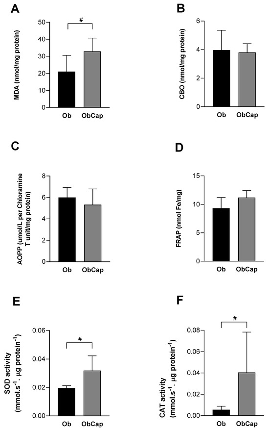 Effect of capsinoid treatment on cardiac biomarkers of oxidative stress and on antioxidant enzymes. (A) MDA: malondialdehyde. (B) CBO: carbonyl proteins. (C) AOPP: advanced oxidation protein products. (D) FRAP: iron-reducing antioxidant capacity. (E) SOD: superoxide dismutase. (F) CAT: catalase. Groups Ob: obese (n = 6); ObCap: obese treated with capsinoids (n = 7). Values are expressed as mean ± standard deviation. Student t-test for independent samples -# p < 0.05-ObCap vs. Ob.