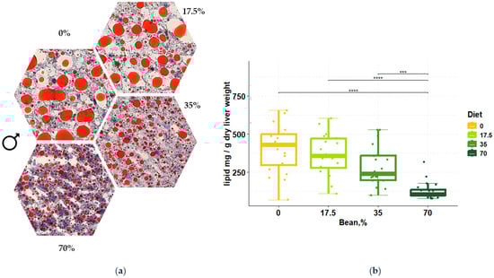 Bean prevents the accumulation of lipid droplets in the liver of male animals in a dose-dependent manner. (a) Oil Red O- and hematoxylin-stained liver sections across different diets: percentage indicates the amount of total dietary protein derived from common bean. Extracellular and intracellular lipid is stained red and hepatic nuclei are stained blue. (b) Box plots of the bean dose effect on the hepatic lipid. Values represent the amount of lipid in mg normalized to g of dry liver weight across the diet groups. Groups indicate total dietary protein percent sourced by beans. Kruskal–Wallis testing showed significant differences in the diet effect (χ2 = 36.09, p-value = 7.167 × 10−8) with the large effect size (η2 = 0.435). Pairwise comparisons between the diet groups were conducted using the post-hoc Dunn test: *** q-value < 0.001; **** q-value < 0.0001 (adapted from []).
