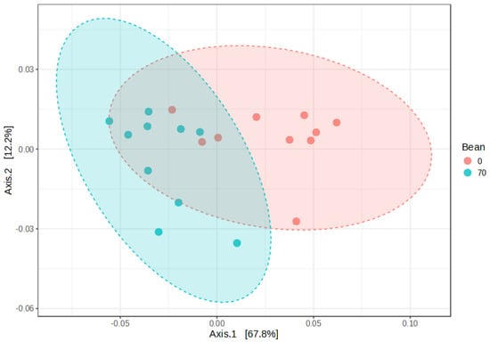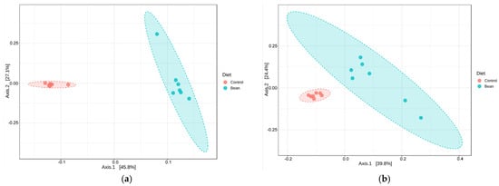 The plasma and liver tissue metabolite datasets comprise a total of 1024 metabolites (919 named and 105 unnamed metabolites) and 1065 metabolites (958 named and 107 unnamed metabolites), respectively. Principal coordinates analysis (PCoA) can be used to quickly assess the magnitude of the effect of experimental conditions compared to each other and population variability. Samples with similar biochemical profiles cluster together, whereas samples with distinct profiles segregate away from one another. In this study, the diet composition (0% and 70% bean protein) appears to drive clear separation between the study groups (Figure 2) in both matrices (liver and plasma), pointing to distinct metabolomic profiles. PERMANOVA analysis confirmed the separation between the groups in the liver (R2 = 0.439, pseudo-F-value = 9.376, and p-value = 0.003) and plasma (R2 = 0.336, pseudo-F-value = 6.074, and p-value = 0.003).