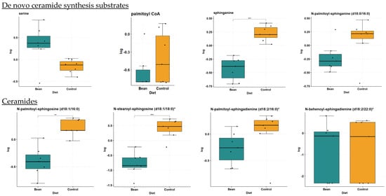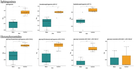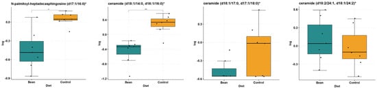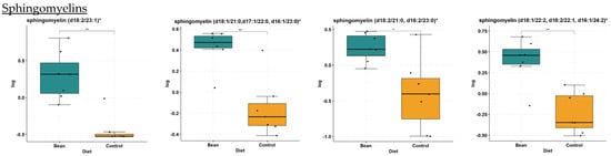 Sphingomyelins are increased in the bean-fed group (Table 4). Out of 26 sphingomyelins and dihydrosphingomyelins detected in the liver samples, 9 increased in the bean treatment (i.e., sphingomyelin (d18:2/23:1) FC = 2.16, p-value = 4.64 × 10−4, and q-value = 2.84 × 10−3). Selected box plots are shown in Figure 5. The other 17 metabolites were not nominally significantly different between treatments. These data suggest that bean treatment does not activate the sphingomyelin hydrolysis pathway leading to ceramide regeneration but rather indicates ceramide biotransformation into endpoint sphingomyelins.