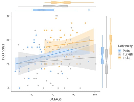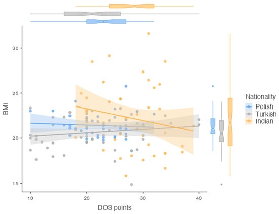 There was no correlation between the DOS score and the BMI value (p = 0.390). Figure 1 shows the distribution of the DOS scale scores according to the subjects’ BMI and nationality.
