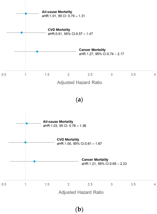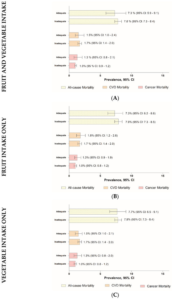 APA StyleTan, L. K., Zainuddin, N. H., Tohar, N., Sanaudi, R., Cheah, Y. K., Omar, M. A., & Kee, C. C. (2024). Daily Adequate Intake of Fruit and Vegetables and All-Cause, Cardiovascular Disease, and Cancer Mortalities in Malaysian Population: A Retrospective Cohort Study. Nutrients, 16(18), 3200. https://doi.org/10.3390/nu16183200