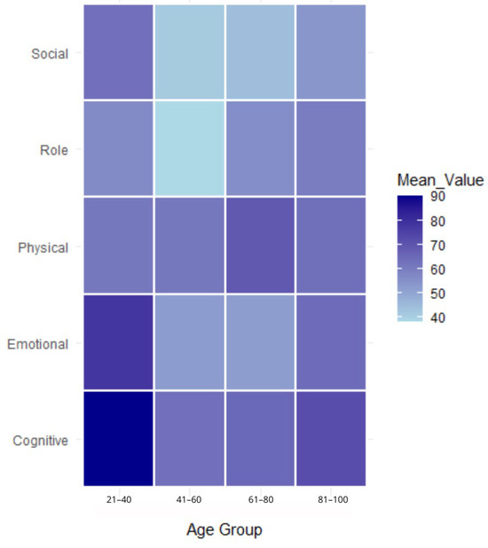 Figure 1 presents a heatmap of the mean response score by age group. The heatmap visualizes the mean value across a spatial grid. Density scores were computed based on the number of data points assigned to each grid cell, with more intensive colors indicating higher densities, visualizing the number of points in each scale for each age group. Differences in the quality of life domains across various age groups can be observed.