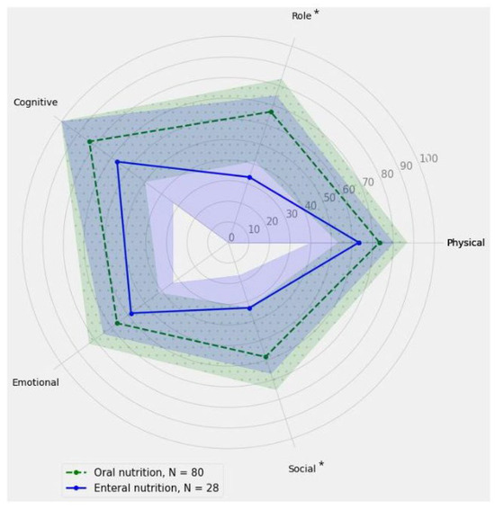 The comparison of the main subscales’ measurements of the EORTC QLQ-C30 for orally and enterally fed patients in the study group. The solid line represents the results obtained in points for individual subscales within the enteral nutrition group, while the dashed line corresponds to the results obtained in points for individual subscales within the oral nutrition group. The shaded areas indicate the confidence intervals (CIs). An asterisk indicates statistical significance at the level of p ≤ 0.05.