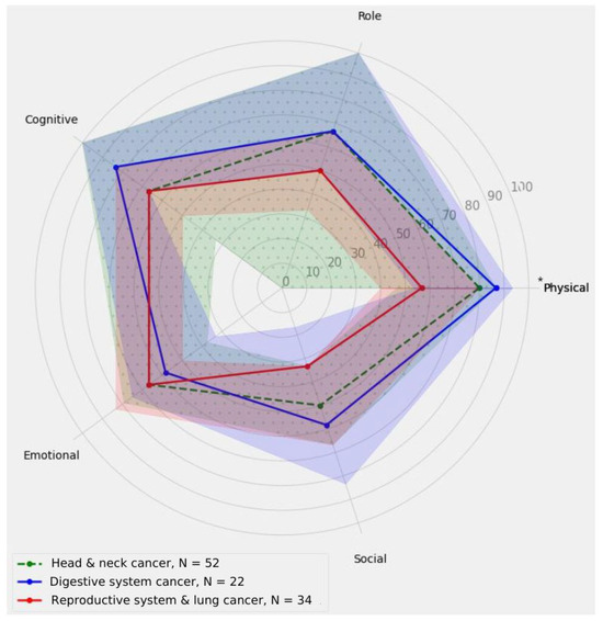The comparison of the main subscales’ measurements of the EORTC QLQ-C30 for different type of cancer groups. The solid blue line represents the results obtained in points for individual subscales within digestive system cancer patients, the solid red line represents the results obtained in points for individual subscales within reproductive system cancer patients, and the dashed line corresponds to the results obtained in points for individual subscales within the head and neck cancer patient group. The shaded areas indicate the confidence intervals (CIs). An asterisk indicates statistical significance at the level of p ≤ 0.05.