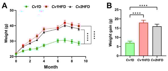 Over the 41 weeks of HFD administration, we found that Cv2 did not significantly alleviate HFD-induced weight gain in female mice. As shown in Figure 1, there was no significant difference in BW between the Cv1HFD and Cv2HFD groups (p ≥ 0.05).