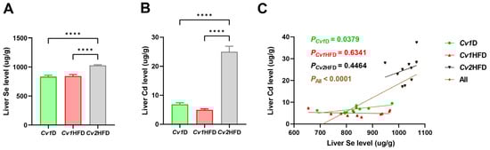 Compared with those of the Cv1D or Cv1HFD group, the accumulation of Se significantly increased by ~22% in the livers of the Cv2HFD group (p < 0.0001; Figure 2A), while the accumulation of Cd significantly increased by 360% or 500%, respectively (p < 0.0001; Figure 2B). However, there was no difference in either Se or Cd between the Cv1D and Cv1HFD groups (p ≥ 0.05). We also observed a significant association between the Se and Cd levels in the Cv1D group (R2 = 0.4822, p = 0.0379) and all mice (R2 = 0.5612, p < 0.0001; Figure 2C). Furthermore, no differences were observed in the concentrations of copper, iron, and zinc among the Cv1D, Cv1HFD, and Cv2HFD groups (p ≥ 0.05; Figure S1A–C).