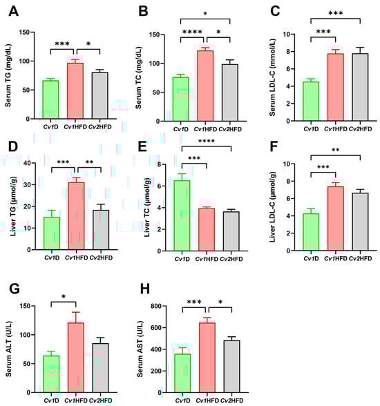 Compared with the Cv1HFD group, Cv2 significantly decreased the serum levels of TG (20%, p < 0.05; Figure 3A) and TC (210%, p < 0.05; Figure 3B), as well as liver TG (69%, p < 0.05; Figure 3D), in the Cv2HFD group, without a significant effect on the serum LDL-C (p ≥ 0.05; Figure 3C) and liver TC and LDL-C (p ≥ 0.05; Figure 3E,F). Furthermore, although no difference was observed in the serum ALT activity (p ≥ 0.05; Figure 3G), Cv2 alleviated HFD-induced liver injuries, characterized by a ~33% decrease in serum AST activity in the Cv2HFD group compared with the Cv1HFD group (p < 0.05; Figure 3H).