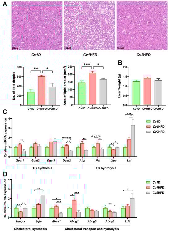 In the Cv1HFD group, unclear intercellular boundaries, shrinking nuclei squeezed to the edges of the cell, and the disordered arrangement of hepatic cords were observed (Figure 4A). In the Cv2HFD group, hepatic lipid droplets were significantly fewer and smaller, with clearer boundaries of liver cells than those in the Cv1HFD group (p < 0.05). However, there was no significant difference in the liver weight among the Cv1D, Cv1HFD, and Cv2HFD groups (p ≥ 0.05; Figure 4B).