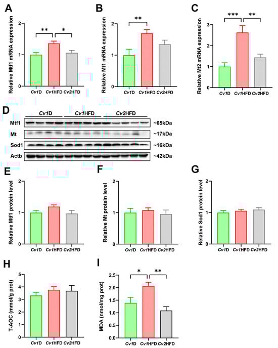 Compared with those of the Cv1HFD group, Cv2 significantly downregulated the elevated mRNA expression levels of metal regulatory transcription factor 1 (Mtf1) and metallothionein 2 (Mt2) caused by the HFD in the livers of the Cv2HFD group (p < 0.05; Figure 5A,C). Furthermore, no differences in the relative protein levels of Mtf1, Mt, and Sod1, as well as the T-AOC level, were observed among the Cv1D, Cv1HFD, and Cv2HFD groups (p ≥ 0.05; Figure 5E–H). However, we found that, compared with the Cv1HFD group, Cv2 significantly decreased the liver MDA level in the Cv2HFD group by ~75% (p < 0.05; Figure 5I).