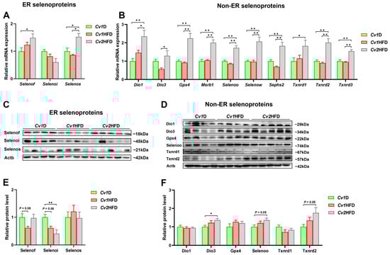 Compared with those of the Cv1D group, the relative protein levels of the ER-resident Selenoi and the non-ER-resident Dio3 were, respectively, downregulated and upregulated in the livers of the Cv2HFD group (p < 0.05; Figure 6C–F). Furthermore, compared with those of the Cv1HFD group, the relative protein level of Selenoh was upregulated in the livers of the Cv2HFD group (p < 0.05; Figure S3C,D). Although there were no differences in the relative protein levels of Selenoo and Txnrd2 among the Cv1D, Cv1HFD, and Cv2HFD groups, there was an upregulatory trend in the Cv2HFD group (p = 0.05).