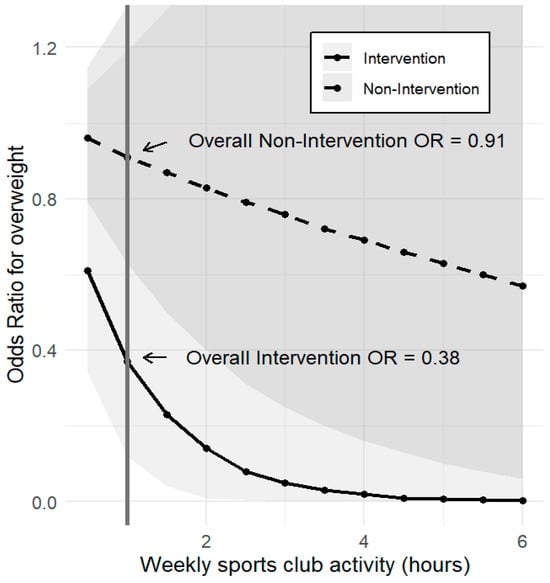 Figure 1 illustrates a dose–response relationship. The intervention group had a more rapid reduction in the odds ratio of overweight, for the same hours of weekly sports club activity, than the non-intervention group. The shaded areas show the 95% confidence intervals for each intervention group. The darkest shaded area indicates overlapping of the confidence intervals for the two groups.
