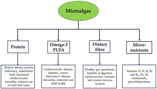 Protein is an essential component of human food for the growth and maintenance of cells and tissues. Dietary protein deficiency is widespread, as shown by a Global Burden of Disease 2019 estimate of around 147 million cases of protein-energy malnutrition worldwide, leading to about 212,000 deaths annually [92]. Table 3 highlights the role of microalgae in providing protein to meet recommended intake targets.