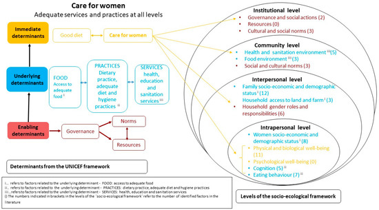 According to the UNICEF framework, good care is the result of adequate practices (e.g., dietary practices, referring to adequate food preparation, food consumption and hygiene practices) and adequate services (e.g., adequate nutrition, health, education, sanitation and social protection services, as well as healthy food environments) that support good diets [12]. To place more emphasis on the importance of good care for pregnant women, we therefore added “care for women” as a new subcategory at all levels of the socio-ecological framework (see Figure 1).