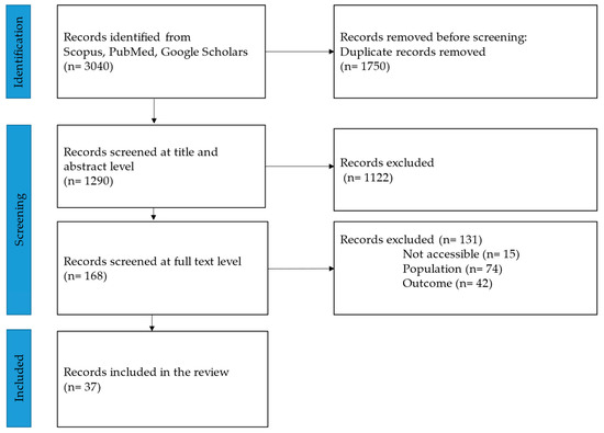 In total, 37 studies met the inclusion criteria and were included in the review. Figure 2 presents the study selection process and related PRISMA flowchart. Table 2A,B summarise the characteristics of the included studies.