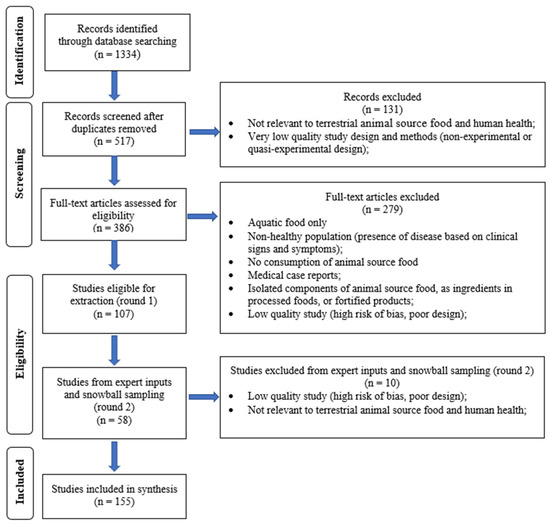 This review had some limitations. First, we covered terrestrial animal source foods originating from assessment of livestock-derived foods and human health, to the exclusion of aquatic ASFs. Aquatic foods similarly provide important nutrients in bioavailable forms and can protect nutrition during vulnerable periods of the life course [152]. Another limitation in our review is the potential gap in the assessment by excluding non-English language papers. There were also limitations in the evidence base that speak to future research needs. The preponderance of the evidence assessed examined milk and dairy products. Beef and eggs, and to a lesser extent white meat, follow in terms of availability of evidence, with few trials on insects and their products. This review did not find any specific study on pig, poultry meat, meat from wild animals, and meat from other livestock species such as goats, sheep, and rabbit. In terms of vulnerable life course phases, we found the evidence base concentrates more heavily on women during pregnancy and lactation and infant and young children, followed by preschool and school-age children and adolescents and significantly less on older adults, especially in LMICs.
