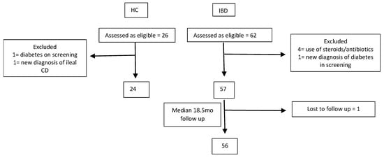 Between March 2019 and April 2021, a total of 57 IBD (mean age 37.7 ± 11.4 years; 39% females; UC n = 26, CD n = 31) and 24 HC (mean age 38.0 ± 11.5; 46% females) participants were included in the study (Figure 1 and Table 1). There were no statistically significant differences between the IBD and HC cohorts in age, sex, anthropometric indices, metabolic and inflammatory indices. There were more smokers and ex-smokers in the IBD group (28% v 4%, p = 0.04).