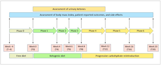 The ketogenic period was structured into three distinct phases. From baseline to the fourth week (phase 1—T0 to T4), patients consumed 4 to 6 protein preparations daily, which were available in various recipes, along with low-carbohydrate vegetables. Each meal preparation provided 90 to 205 kcal, with a protein content between 30% and 72%. Patients were also advised to drink at least 2 L of water or clear liquids (such as tea, coffee, or unsweetened carbonated drinks) per day.