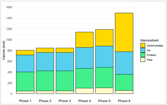 The average daily caloric intake increased from 801 kcal in the first phase to 843 kcal in the second and third phases, 1138 kcal in the fourth phase, 1186 kcal in the fifth phase, and 1490 kcal in the sixth phase. Regarding the macronutrients distribution, the percentage of proteins decreased from 44% in the first three phases to 32% in the fourth and fifth phases, and 20% in the sixth phase. The percentage of fat changed from 39% (4% saturated) in the first phase to 40% (5% saturated) in the second and third phases, 34% (4% saturated) in the fourth phase, 33% (4% saturated) in the fifth phase, and finally 28% (5% saturated) in the last phase. Conversely, the proportion of carbohydrates increased from 10–11% in the first three phases to 25–26% in the fourth and fifth phases and 48% in the sixth phase. Throughout all the study phases, fiber contributed between 4 and 9% of the daily caloric intake. Figure 2 shows the average daily caloric intake and macronutrient distribution in each study phase.