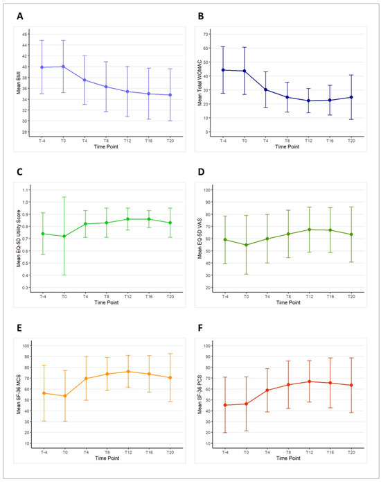 Mean scores and standard deviations of body mass index (BMI—(panel A)), Western Ontario and McMaster Universities Osteoarthritis Index (WOMAC—(panel B)), the EuroQoL 5 Dimensions 3 Levels (EQ-5D) utility score (panel C) and visual analog scale (VAS—(panel D)), the 36-item Short Form Health Survey (SF-36) mental component score (MCS—(panel E)), and physical component score (PCS—(panel F)) across the study time points.