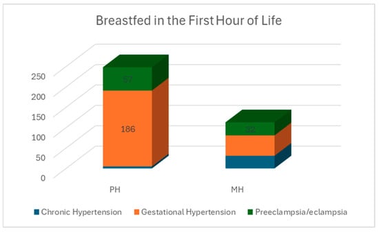 The intention to breastfeed was similar between the hospitals. The percentage of those stating they intended to breastfeed was slightly lower in the PH group, at 83% (439 out of 529), than in the MH group, at 84% (155 out of 185). However, it was not statistically significant (Fisher’s Exact t-test p = 0.451). Across all the participants, in the first hour of life, 51% (n = 361) initiated breastfeeding, while 49% (n = 353) did not. When evaluated by hospital and HDP category, initiation in the first hour of life differed. In the PH, 47% of the participants breastfed in the first hour of life compared to 61% at the MH, which was significant (Pearson Chi-square 11.06 p = 0.002). Based on the HDP category, at the PH, of those who initiated breastfeeding in the first hour of life, 2% had CH, 75% had GH, and 23% had PREE. Of those who breastfed in the first hour at the MH, 27% had CH, 44% had GH, and 28% had PREE, as shown in Figure 1.