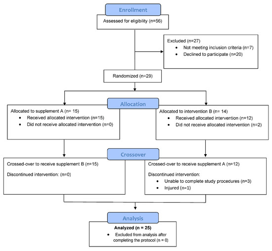 A total of 56 participants were assessed for eligibility, and 29 were entered into the study, with 25 completing all aspects of the protocol (Figure 1). Using data from a study with a similar research design, the study participant number provided more than 80% power to detect a difference in pro-inflammatory oxylipins with an effect size of 1.06 at alpha 0.05 using two-sample t-tests [20]. Participants voluntarily signed the informed consent form, and procedures were approved by the university’s Institutional Review Board (IRB 22-0114). Trial Registration: ClinicalTrials.gov, U.S. National Institutes of Health, identifier: NCT05407701.