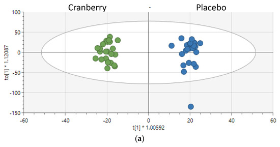 (a) OPLSDA analysis of 24 h urine samples collected before and after the 4-week supplementation period. R2X = 0.142, R2Y = 0.98, Q2 = 0.416. Data represent metabolite changes when comparing post- and pre-supplementation urine samples. (b) Urine metabolites that were higher in the cranberry trial supported the trial separation data from (a). Metabolites were selected that met these criteria: VIP > 2.0, FDR p < 0.05, high ontology annotation, and literature confirmation as a cranberry-related metabolite. Box plots for the six metabolites show the distribution of the 4-week change in peak intensity for the cranberry and placebo trials.