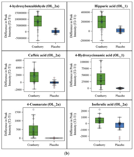 OPLSDA analysis of the untargeted metabolomics data (12,818 peaks) from urine samples collected 24 h before and after each supplementation period indicated a strong cranberry versus placebo trial separation (R2Y = 0.98) and a moderate indication that the data were reproducible (Q2 = 0.416, Figure 2a) even with the small sample size used in this study. The distribution of the difference in peak intensity (post-supplementation minus pre-supplementation or T2-T1) for six metabolites is shown in Figure 2b. These metabolites had a variable importance in the projection (VIP) of more than 2.0, an ontology level that included a retention time match, an FDR p-value < 0.05, and literature confirmation as a cranberry-related metabolite. These included significant increases in hippuric acid, 4-hydroxybenzaldehyde, 4-hydroxycinnamic acid, 4-coumarate, isoferulic acid, and caffeic acid (other potential matches for these peaks are provided in Supplementary Data Sheet S3). Supplementary Data Sheet S3 provides the VIP and p-values for the top 90 metabolites that matched the in-house library at an ontology level of OL_1 or OL2a.