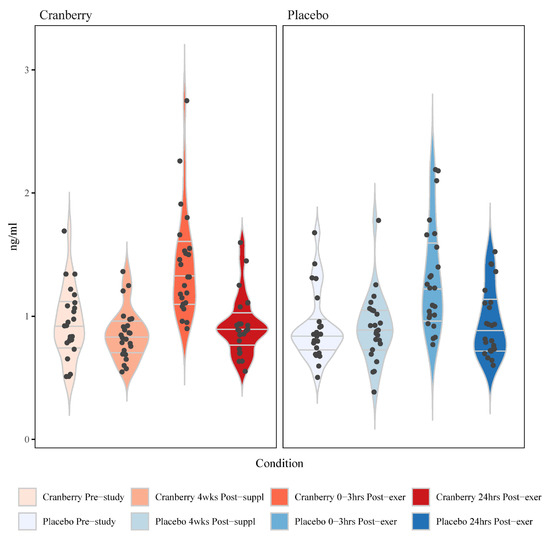 Significant post-exercise increases were measured for the delayed onset of muscle soreness (DOMS), muscle damage biomarkers serum myoglobin and creatine kinase, white blood cell counts and the neutrophil/lymphocyte ratio, and serum cortisol in both the cranberry and placebo trials, with no differences in the pattern of change over time (all interaction effects, p > 0.20.