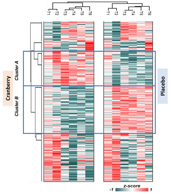 The top 10 key proteins associated with cluster B were lower in the cranberry versus placebo trial.