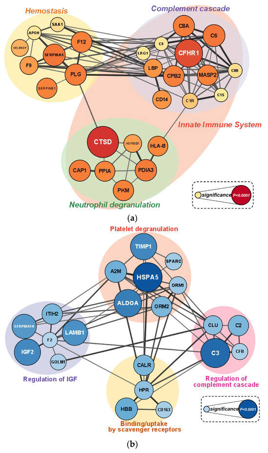 (a) Cluster A (elevated in the cranberry trial) visualizes the protein–protein interaction (PPI) network for proteins enriched in reactome pathway analysis. The size and color of the nodes indicate the p-value from the two-way ANOVA analysis. Proteins with four or more interactions and statistical significance were chosen as key proteins in the pathway. (b) Cluster B (lower in the cranberry trial) visualizes the protein–protein interaction (PPI) network for proteins enriched in reactome pathway analysis. The size and color of the nodes indicate the p-value from the two-way ANOVA analysis. Proteins with four or more interactions and statistical significance were chosen as key proteins in the pathway. See Table 4 and Table 5 for an explanation of the abbreviations.