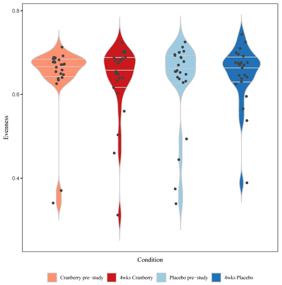 Whole genome shotgun (WGS) sequencing was conducted on the stool samples collected before and after 4-weeks of supplementation with cranberry or placebo beverages. The sequencing output was converted, and alpha diversity was calculated by evenness and beta diversity for Bray–Curtis dissimilarity. ANCOM differential abundance analysis was performed using QIIME2. A total of 5719 taxa were identified, with 339 that were present in more than 20% of stool samples used in the analysis. Figure 6 depicts the box whisker plots for the pre- and post-4 week supplementation of stool sample microbiome alpha diversity (observed richness or the number of taxa) with cranberry and placebo beverages. No significant time or interaction effects were found (time effect p = 0.650, interaction effect p = 0.302). PERMANOVA analysis for beta diversity showed no differences in the microbiome profiles between the samples (F = 0.350, p = 0.993). No genus or species differences were found after 4-weeks of cranberry consumption compared to placebo beverage intake.