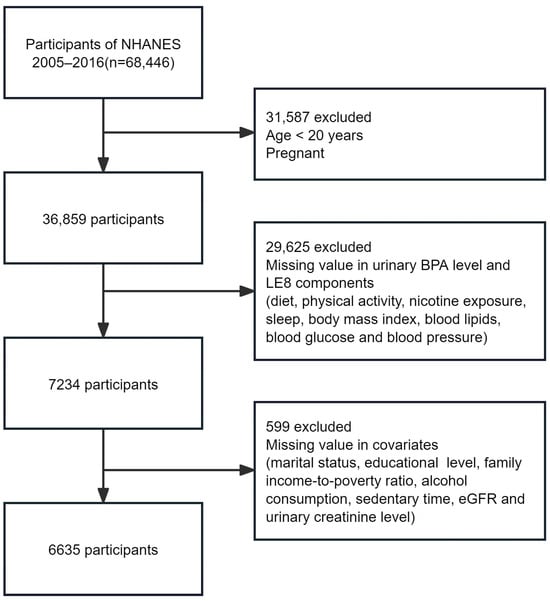 Using a multistage probabilistic design, NHANES samples about 5000 U.S. residents annually to represent the non-institutionalized civilian populace. Our study is a cross-sectional, retrospective analysis of data spanning 2005–2016, aggregating six two-year NHANES cycles. These years were selected based on the availability of both urinary BPA measurements and the LE8 metric, enabling the assessment of the relationship between BPA exposure and CVH. Although more recent data exist, they do not include the BPA exposure data necessary for this analysis. From 68,446 participants, we focused on 36,859 non-pregnant adults aged 20 years or above. Following exclusions for missing urinary BPA or CVH data (n = 29,625) and incomplete covariate information (n = 599), the final sample size was 6635 (Figure 1).