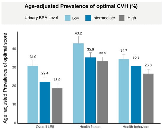 The age-adjusted prevalence of optimal LE8 score was significantly higher among participants with low urinary BPA levels (31.0%, SE: 1.5) compared to those with intermediate (22.4%, SE: 1.2) and high (18.9%, SE: 1.1) BPA levels. This pattern was consistent across both health factors and health behaviors, with a lower prevalence of optimal scores observed in participants with higher BPA levels (Figure 2).