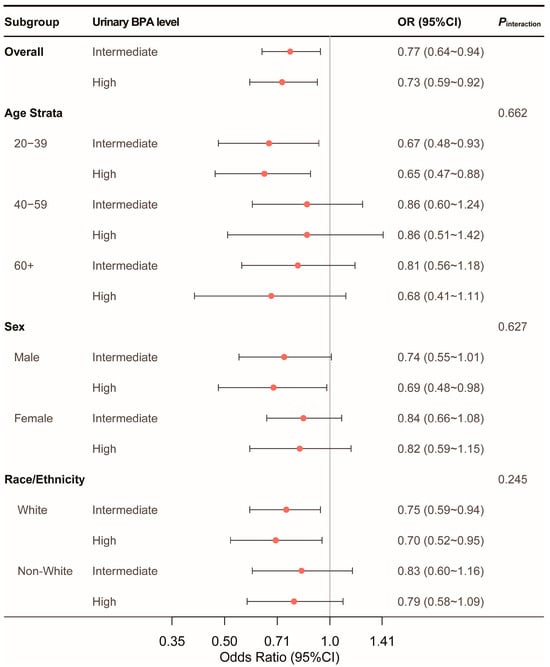 The observed inverse association between urinary BPA levels and optimal CVH persisted across various subgroups, including age, sex, race or ethnicity, with no significant interaction effects detected (Figure 4).