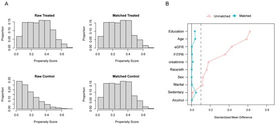 Distribution of propensity score (A) and variables standardized mean difference (B) before and after matching. Matching for age, sex, race/ethnicity, educational level, marital status, FITPR, alcohol consumption, sedentary time, urinary creatinine levels, and eGFR with caliper = 0.05. Abbreviations: FITPR, family income-to-poverty ratio; eGFR, estimated glomerular filtration rate.