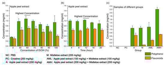 Polyphenol and flavonoid concentrations in apple peel extracts under different extraction conditions. (a) The yield of polyphenol and flavonoids at different ethanol concentrations. (b) The effect of varying extraction times on polyphenol and flavonoids. (c) Polyphenol and flavonoids concentrations in each sample for oral administration. Results are presented as means ± S.D. (n = 6).