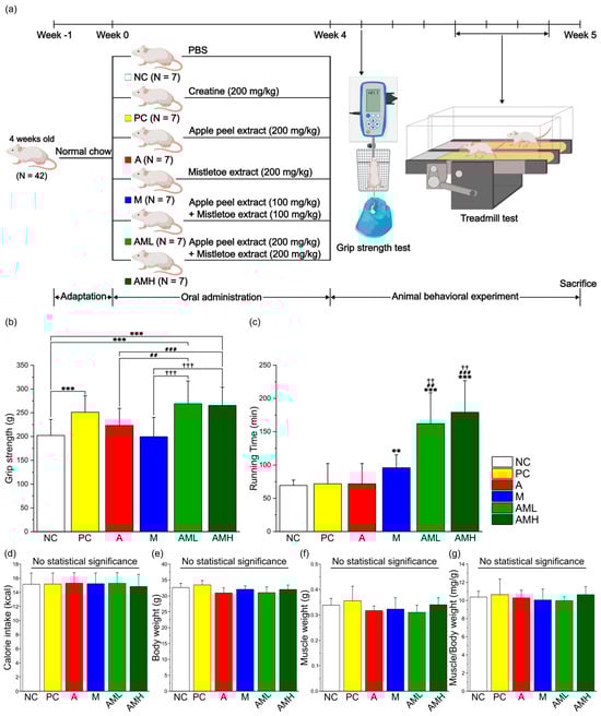 Combination of mistletoe extract and apple peel extract has a synergistic effect on enhancing muscle strength and muscular endurance. (a) Schematic diagram of the animal experiment. (b) Muscle strength measured by grip strength meter. (c) Running time during treadmill test. (d) Average of calorie intake per day. (e) Changes in body weight during the animal experiment. (f) Gastrocnemius (GA) muscle weight after 4 weeks of treatment. (g) Ratio of GA weight to body weight after 4 weeks of treatment. Results are presented as means ± S.D (n = 7). Significance level is indicated as ** p < 0.01, *** p < 0.001 for comparison with the NC group; ## p < 0.01, ### p < 0.001 for comparison with A group; and †† p < 0.01, ††† p < 0.001 for comparison with M group. NC: PBS, PC: Creatine (200 mg/kg), A: Apple peel extract (200 mg/kg), M: Mistletoe extract (200 mg/kg), AML: Apple peel extract (100 mg/kg) and mistletoe extract (100 mg/kg), AMH: Apple peel extract (200 mg/kg) and mistletoe extract (200 mg/kg).